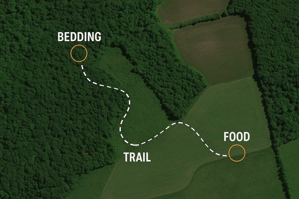 Mark these on your digital map. Compare historical imagery if possible — crop rotation or timber management might affect where deer are feeding this year.