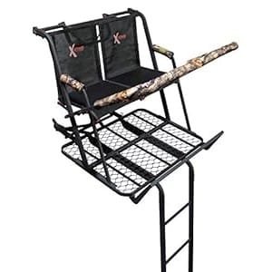 If you’re looking for a pretty solid shooting platform, Guide Gear 16.5′ 2-Man Ladder Tree Stand is the best option for you. The stand is designed for hunting with a friend or family member. It features sturdy steel construction and has a large padded seat with a backrest and armrests for added comfort during long hunting sessions. However, the backrests are almost straight up and down and the seat pad is a bit narrow and thin.