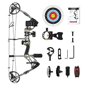 - Camo Compound Bow Kit: This is a right-hand compound bow with an adjustable draw weight of 10 to 40 lbs according to arm span, which works well with any size hands. It could be a perfect gift for beginners or youth in archery competitions. There are seven color options available. However, the camo color helps you better blend into your surroundings for hunting, bowfishing, or even target archery.